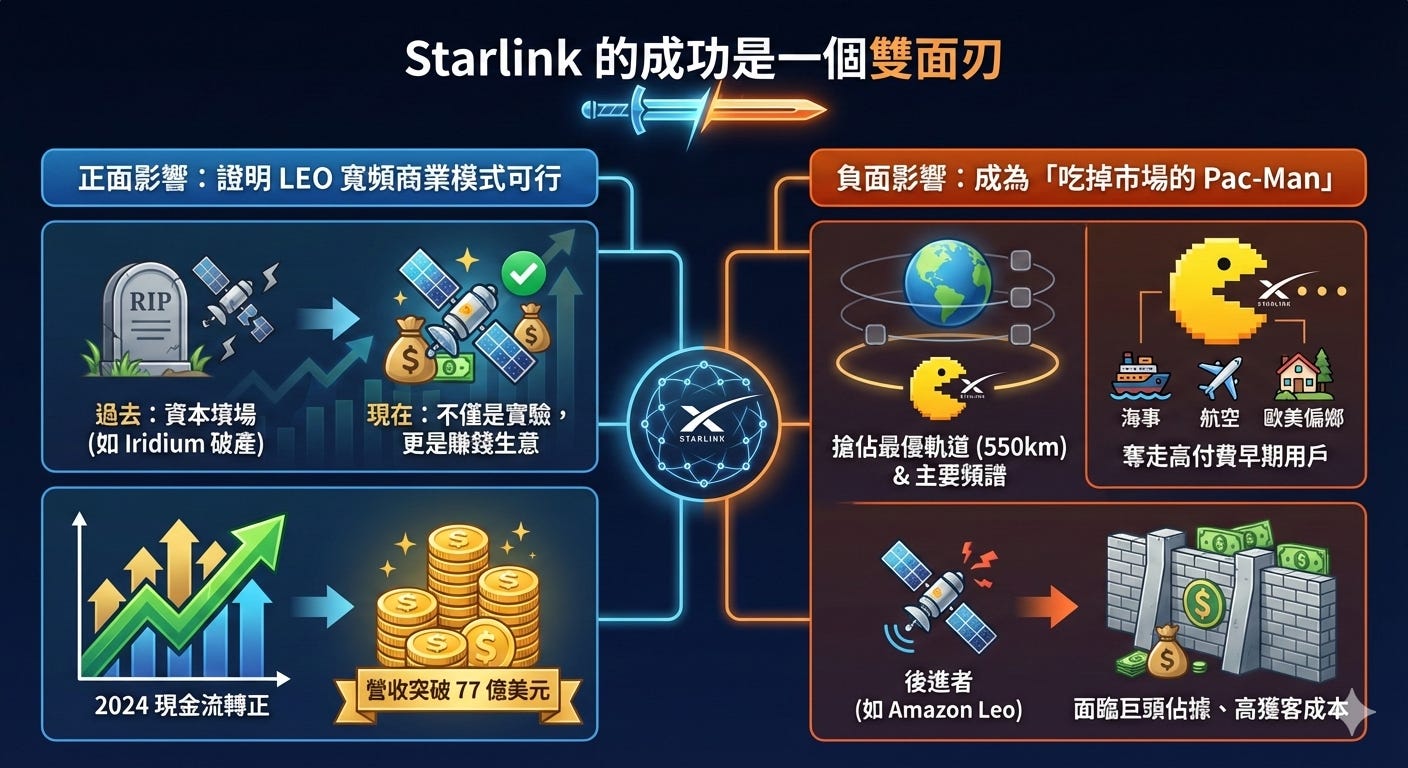 後進者(如 Amazon Leo)現在面臨的是一個已經被巨頭佔據的戰場,必須花費更高的成本來獲取用戶。