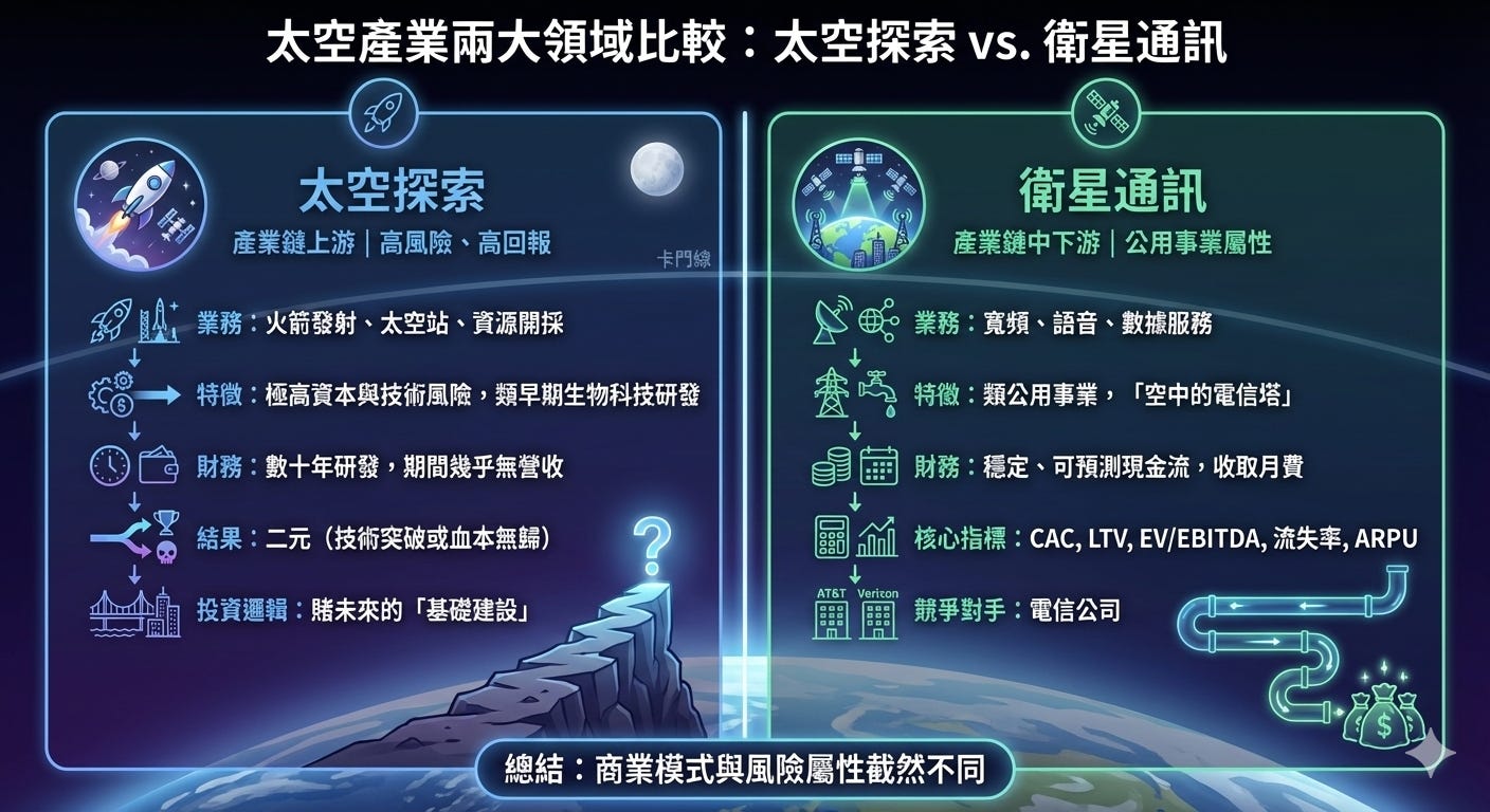 雖然,「太空探索」與「衛星」它們都在卡門線(Kármán line)以外運作,但從商業模式、現金流特徵到風險屬性,兩者截然不同。