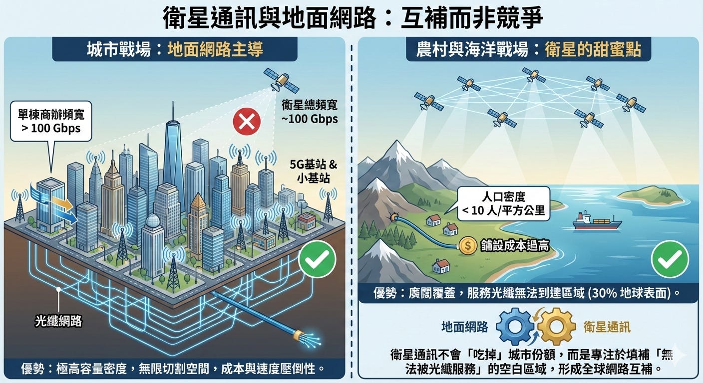 容量經濟學:衛星無法在城市取代地面網路,其甜蜜點在於覆蓋地球 70% 的通訊荒漠,屬於互補而非競爭。