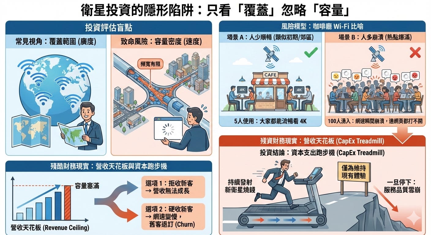 在評估衛星投資時,投資人往往只看「覆蓋範圍(哪裡收得到訊號)」,卻忽略了更致命的「容量密度(網速有多快)」。