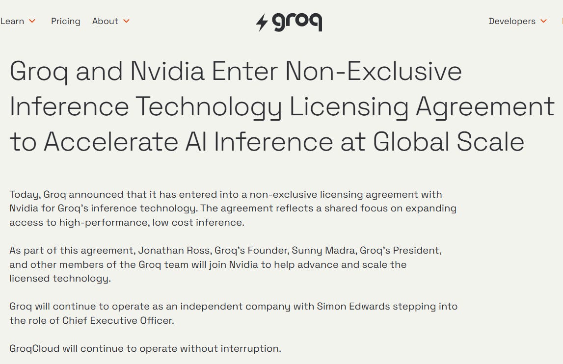當大多數人正準備與家人拆禮物時,一條重磅新聞推送震動了整個科技圈:Nvidia宣布以 200 億美元現金,與 Groq 達成「戰略合作協議」。