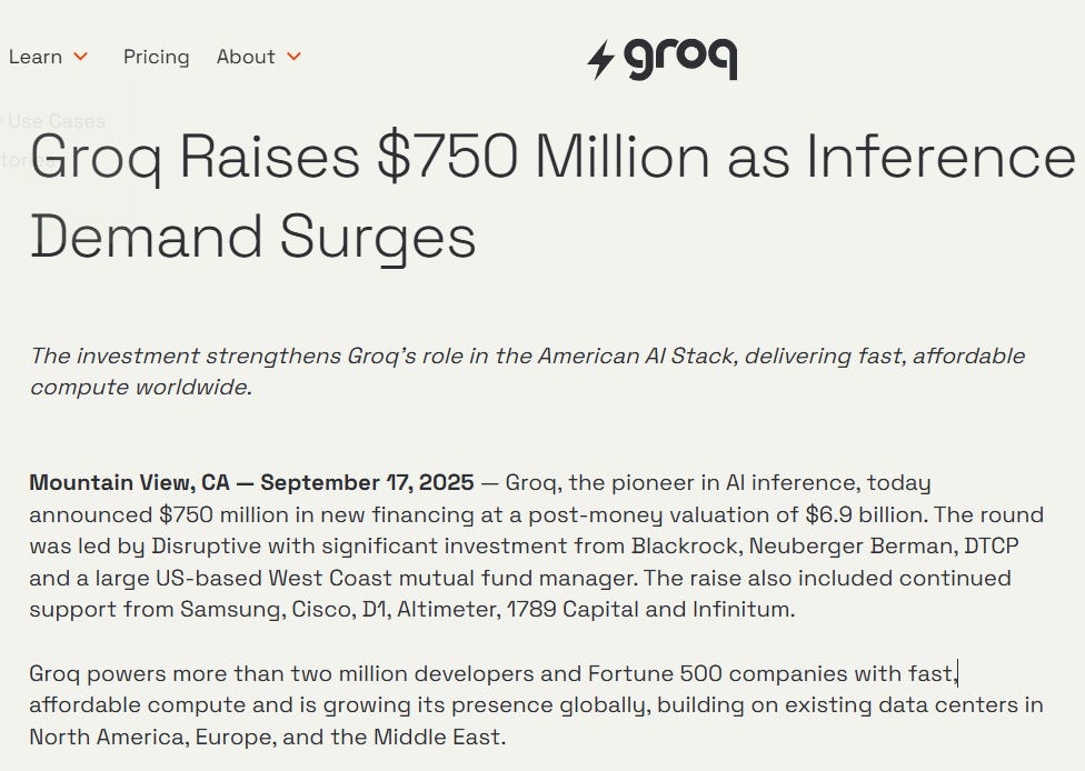2025年9月,Groq 完成了新一輪融資,由 BlackRock(貝萊德) 領投,估值達到69億美元。這份投資名單堪稱豪華:思科 (Cisco)、三星 Catalyst Fund,甚至還有小Donald Trump的1789 Capital。