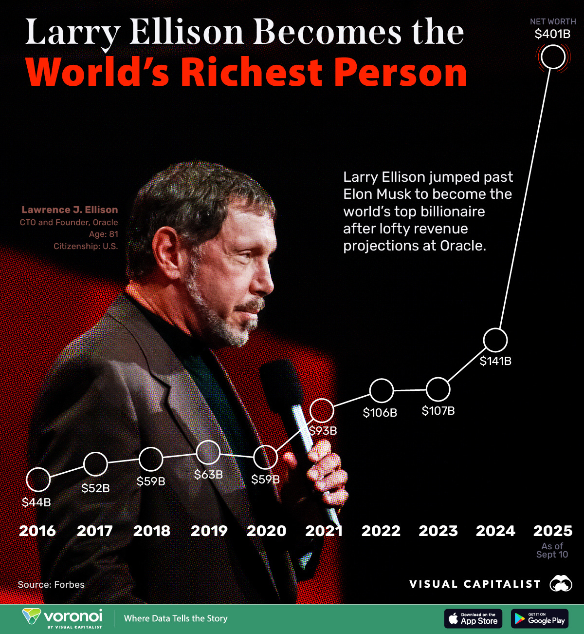隨後在2025年9月,Oracle 秀出了驚人的成績單:手上握有價值數千億美元的未來訂單。華爾街陷入瘋狂,Oracle 股價單日暴漲36%,市值直逼1 兆美元,創辦人 Larry Ellison 甚至短暫當上了全球首富。