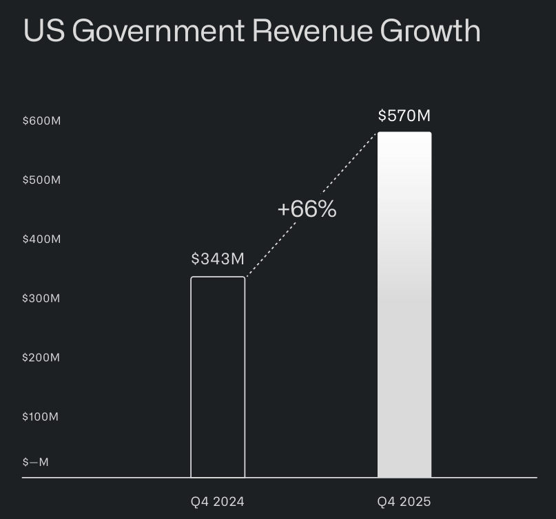 根據最新數據,Palantir 在 2025 年的美國政府部門營收達到 18.55 億美元,僅在第四季度就貢獻了 5.7 億美元(年增 66%)。