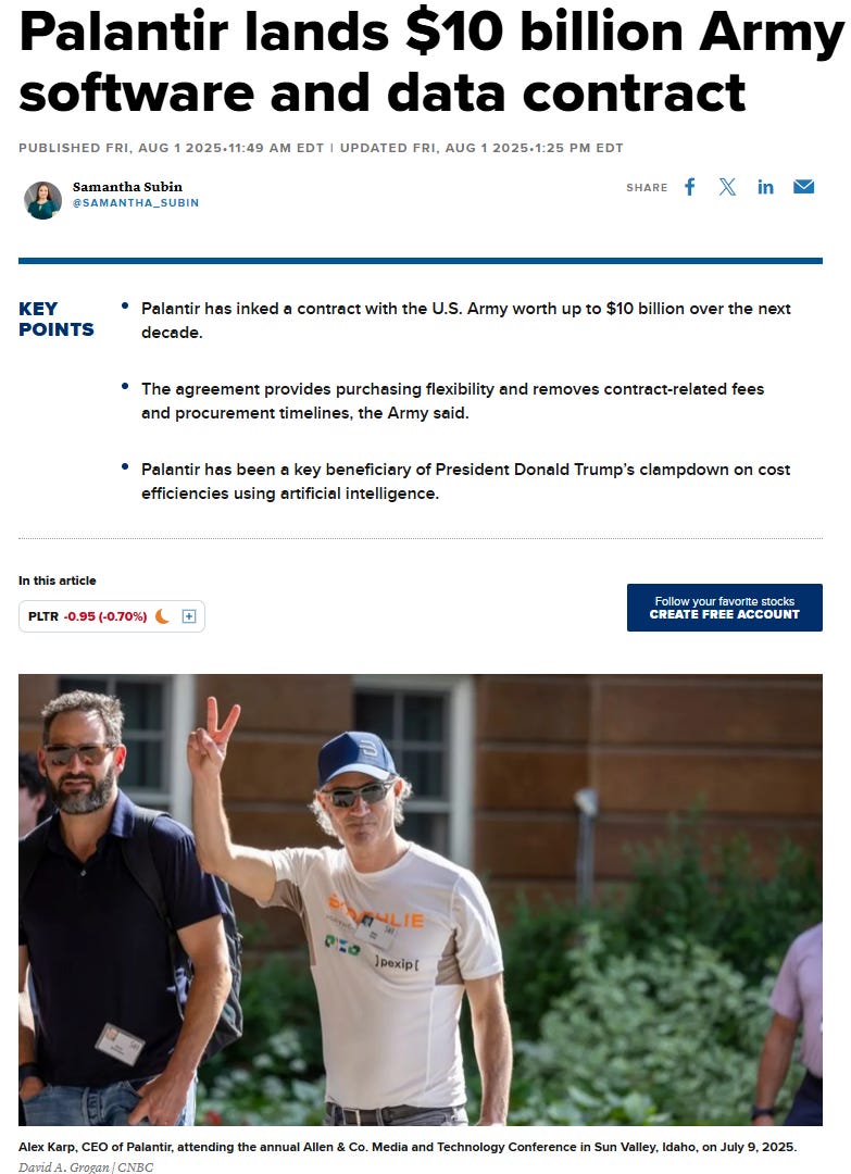 Project Maven 的延伸: 這是美軍最核心的 AI 影像識別計畫。當 Google 因為員工抗議而退出這個計畫時,Palantir 接手了。2025 年這筆最高可達13億美元的續約,確認了 Palantir 是美軍「AI 瞄準系統」的核心大腦。