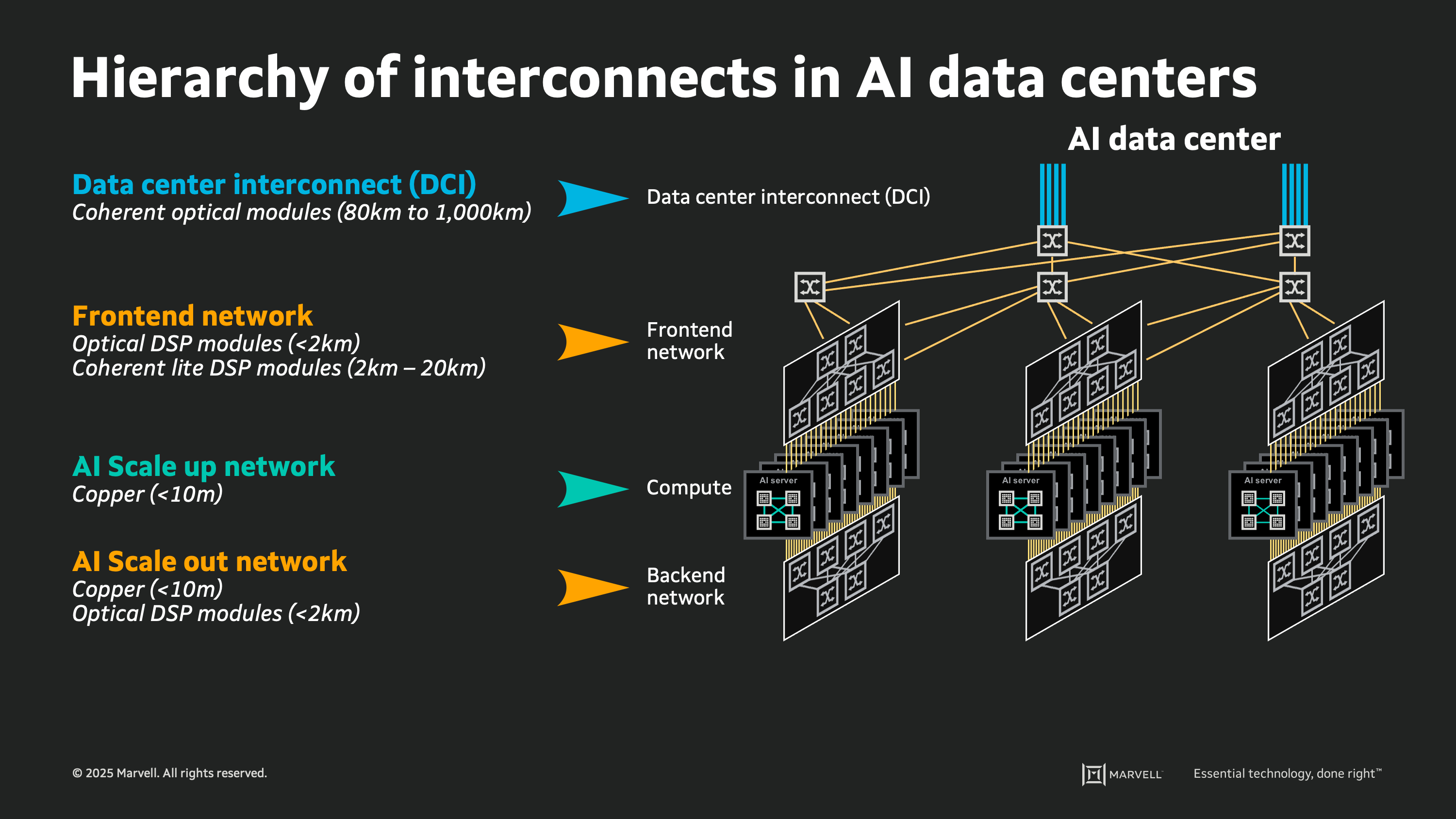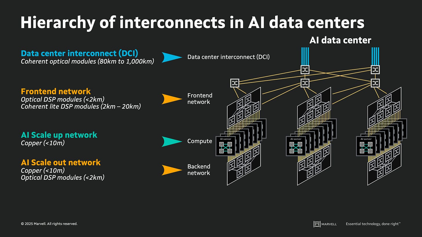 Marvell 則在「光學傳輸」上具備統治力。 當資料傳輸的距離拉長(例如跨越機櫃),銅線的物理極限就會被打破,必須將電訊號轉換為光訊號。