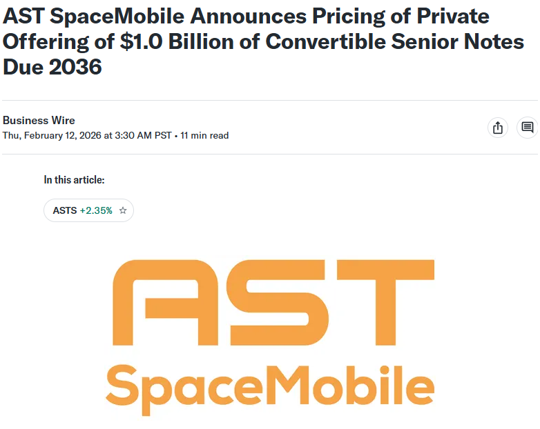 2026年2月,AST SpaceMobile (ASTS)宣佈了一項極其複雜的債務重組計劃:發行10億美元、2036年到期的可轉債,同時回購約3億美元的舊債。消息一出,股價在兩天內應聲暴跌15%。
