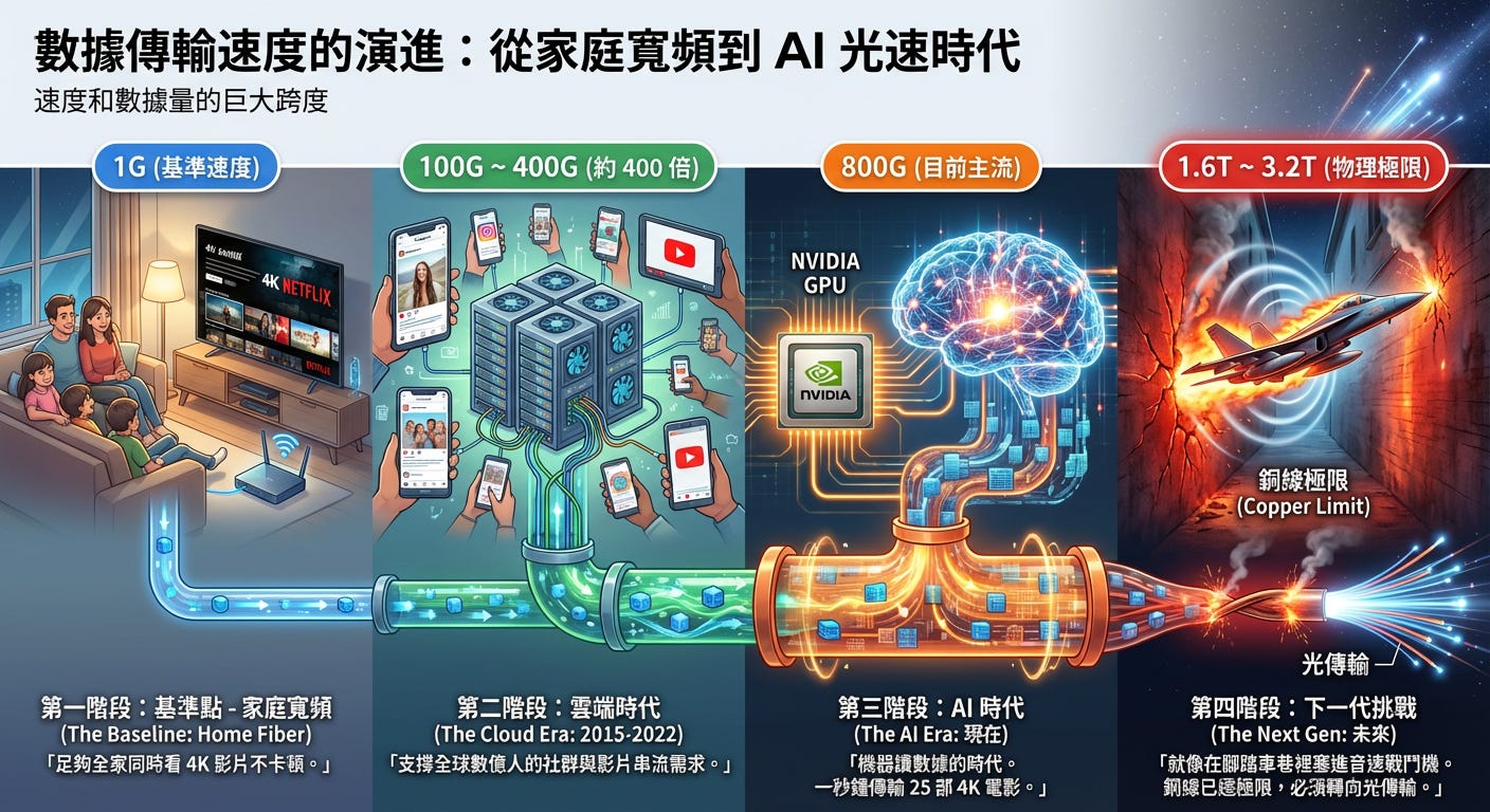 演進之路: 我們已從雲端時代(100G-400G)跨入 AI 時代(800G),現在正凝視著下一代標準(1.6T)。