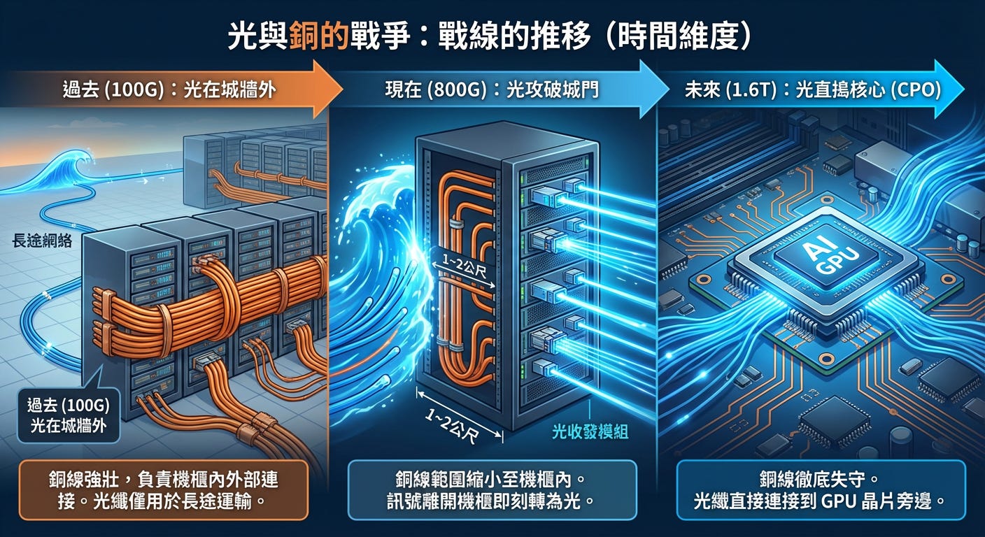 速度 100G 時,銅線還很強壯。機櫃內部的連接,甚至機櫃與隔壁機櫃的連接,都可以用便宜的銅纜搞定。光纖只被用在長途運輸。現在 (AI 爆發期):光攻破城門