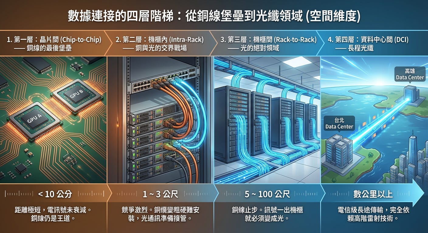 機櫃內部(Intra-rack): 在這個狹窄的空間裡(約 1-2 公尺),Nvidia 目前還能用銅線(NVLink)勉強支撐,配合強大的背板技術,這是銅線最後的堡壘。