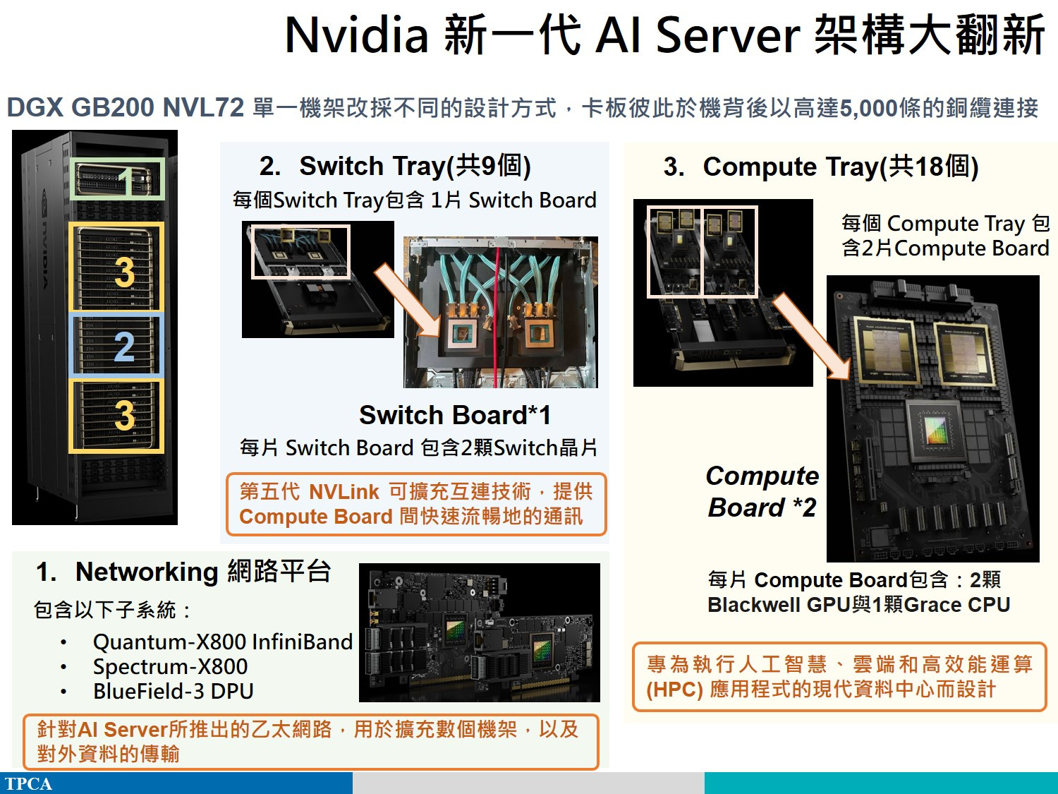 現狀: 這是銅線唯一還能稱王的地方。因為距離極短,電訊號還沒來得及衰減就到了。Nvidia 的 NVLink 目前主要就是在這個層級運作,讓幾顆 GPU 像連體嬰一樣共享記憶體。