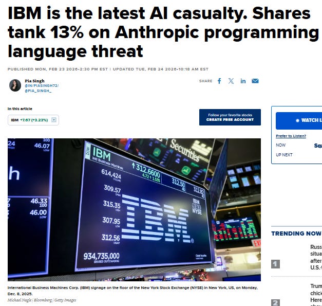 Anthropic現在除了殺軟體公司外,連百年巨人IBM都殺了,股價創下數十年來最大的單日跌幅(13%),