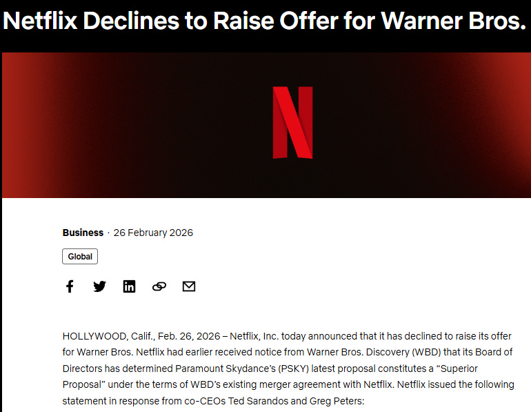 主角 Netflix宣布放棄對華納兄弟探索(WBD)旗下核心資產(包括 HBO Max、華納兄弟影業等)的收購,將這場世紀併購案拱手讓給了出價更高的對手派拉蒙(Paramount Skydance)。