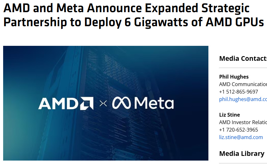 AMD 與 Meta 簽署了一份極具戰略意義、規模高達 600 億美元 的 AI 算力協議,Meta 承諾採購高達 6 GW(吉瓦) 的 AMD Instinct GPU。