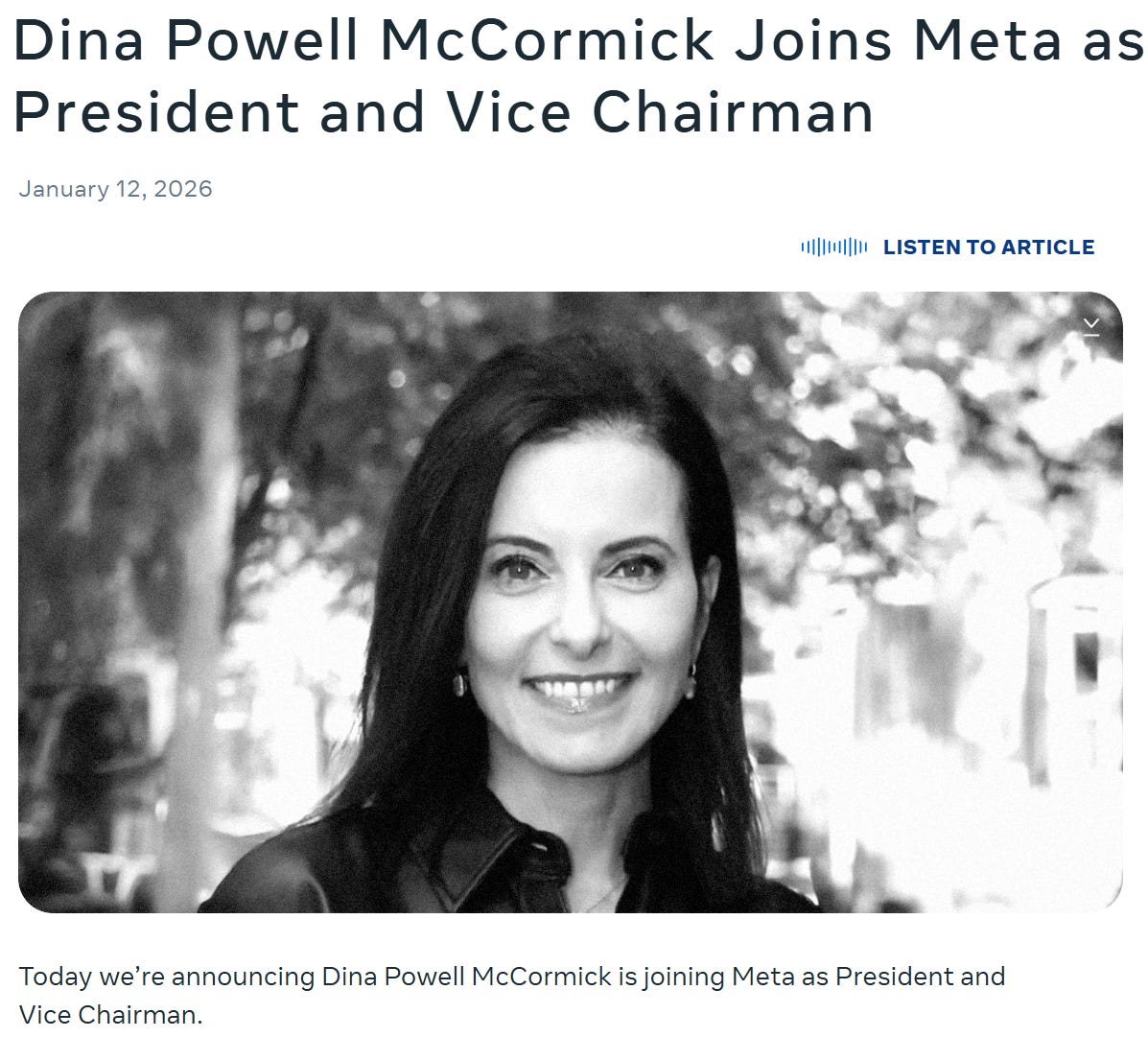 Meta 宣布任命 Dina Powell McCormick 為公司史上首位「總裁兼副董事長」。這一步棋,標誌著 Meta 正式進入了它的「華爾街時刻」。
